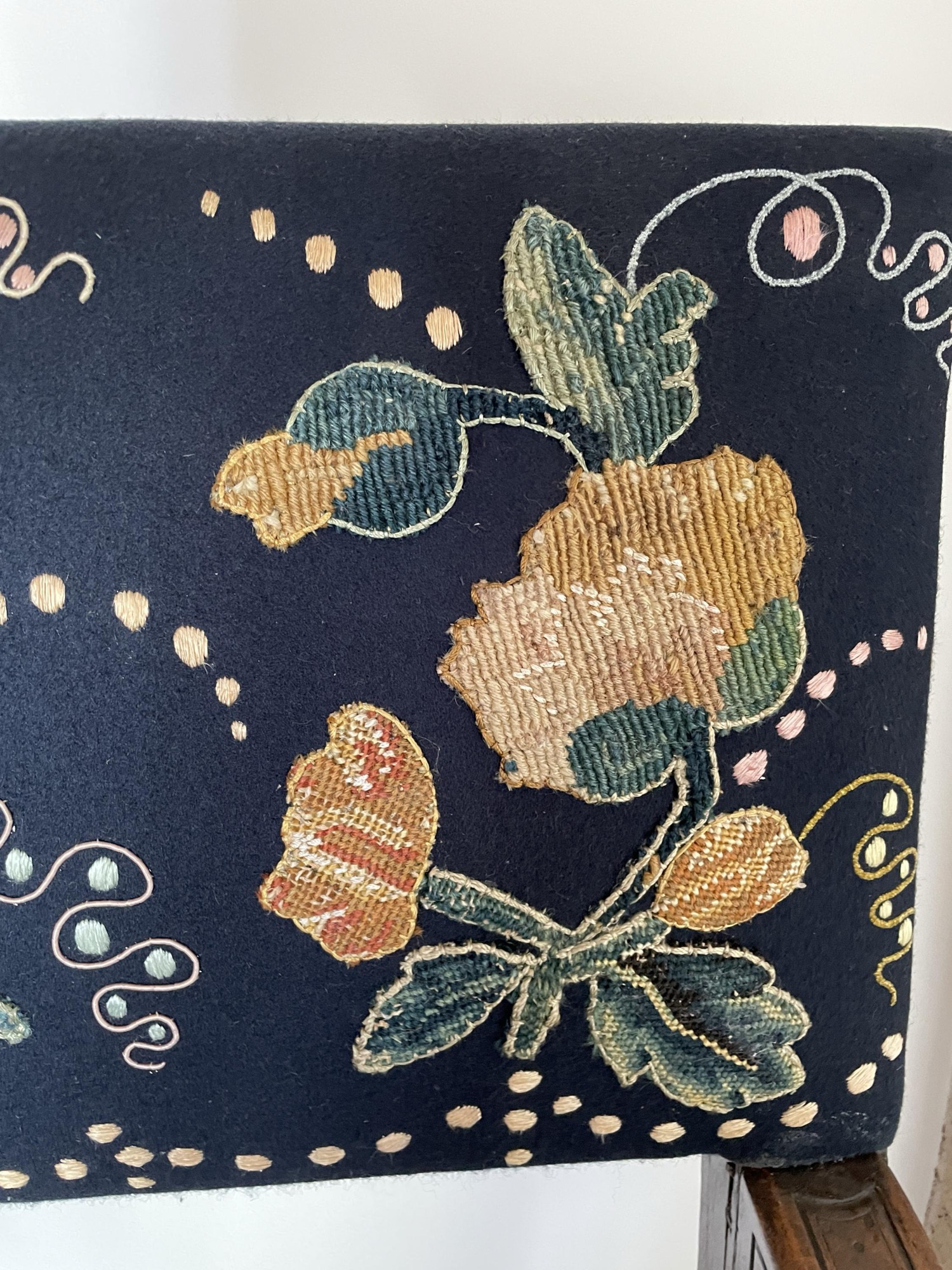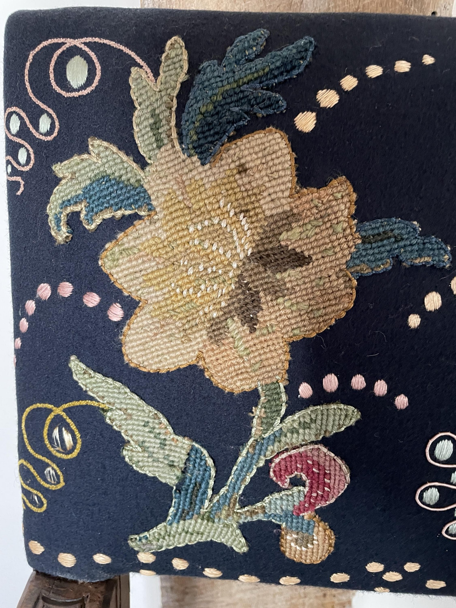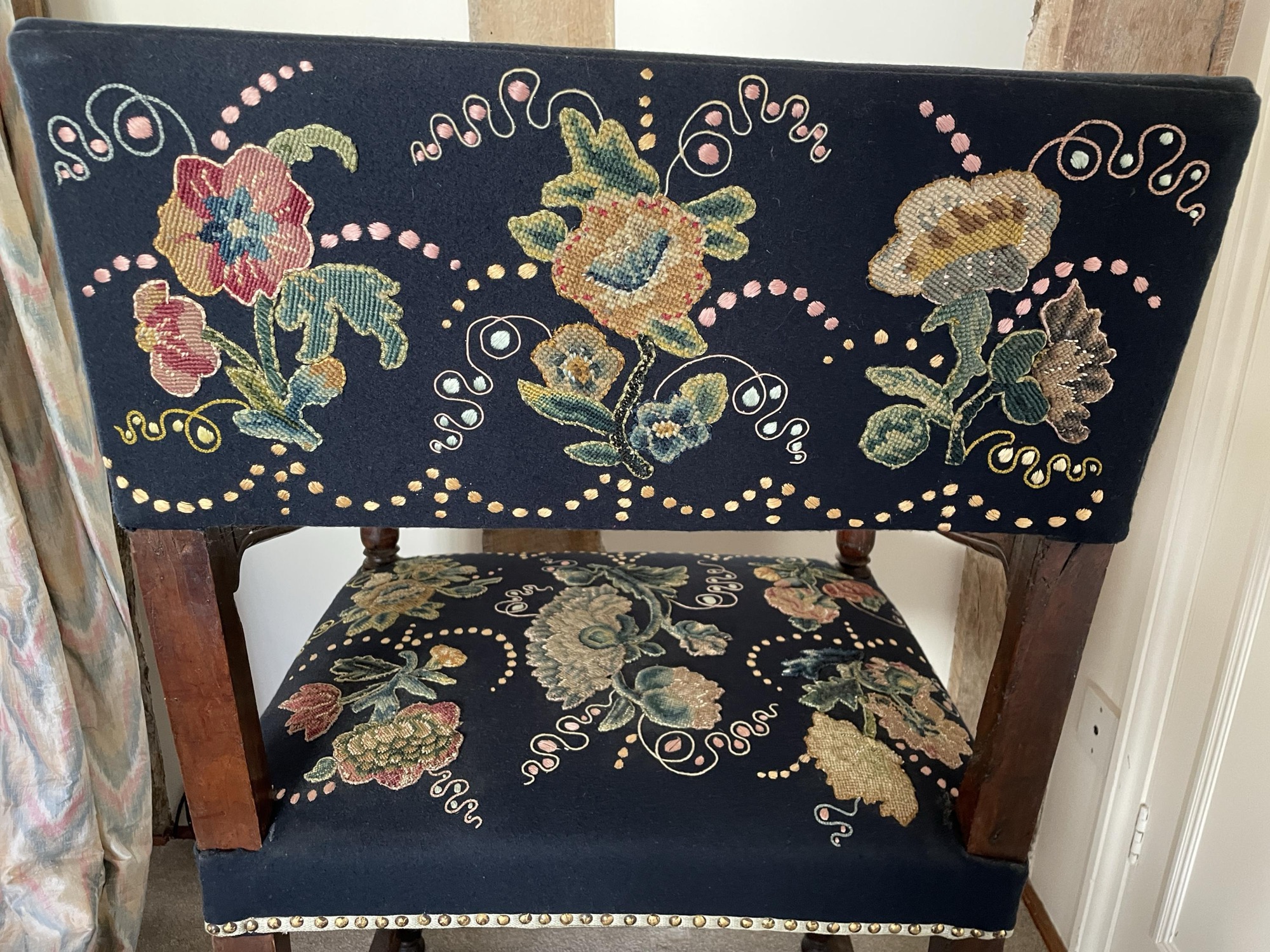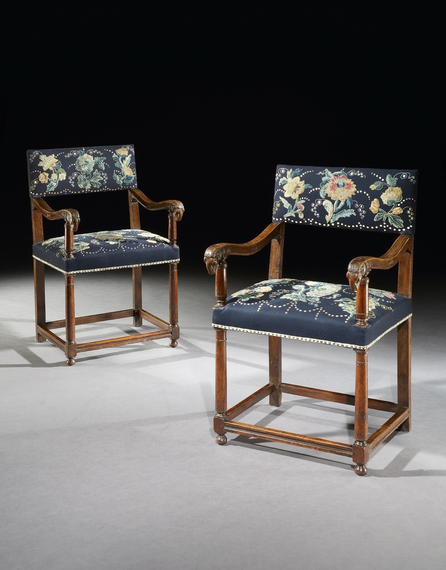 The form of these chairs is characteristic of a stereotypical Renaissance model. The upholstered section of the backs are upholstered in wool with applied 17th century floral needlework faced with gilded studs and supported by square section uprights. The channelled tablet and stylised rosette incised curved arms terminate in acanthus capped carved rams' masks and are supported by column turned uprights headed by an entrelac collar. The ram is a symbol of leadership and authority and it also determination, action, initiative, and Aries, the first sign of the Zodiac. The seats are upholstered in wool with applied 17th century needlework faced with gilded studs and supported by tapering column/ring turned front legs and square section back legs. Some of the stretchers with moulded detailing. Standing on front ball feet. Exceptional original colour and patina. Henri II 1550-60.