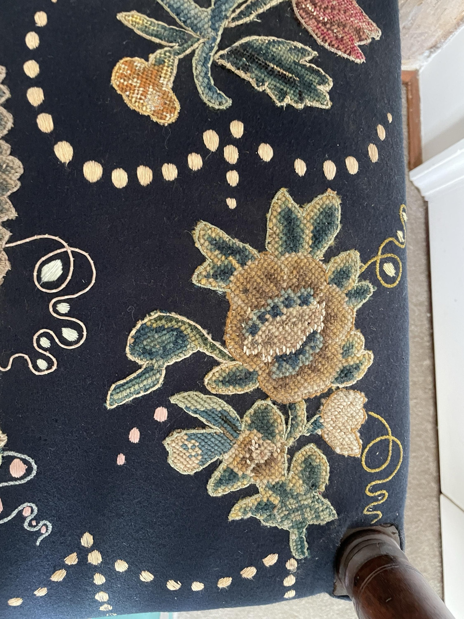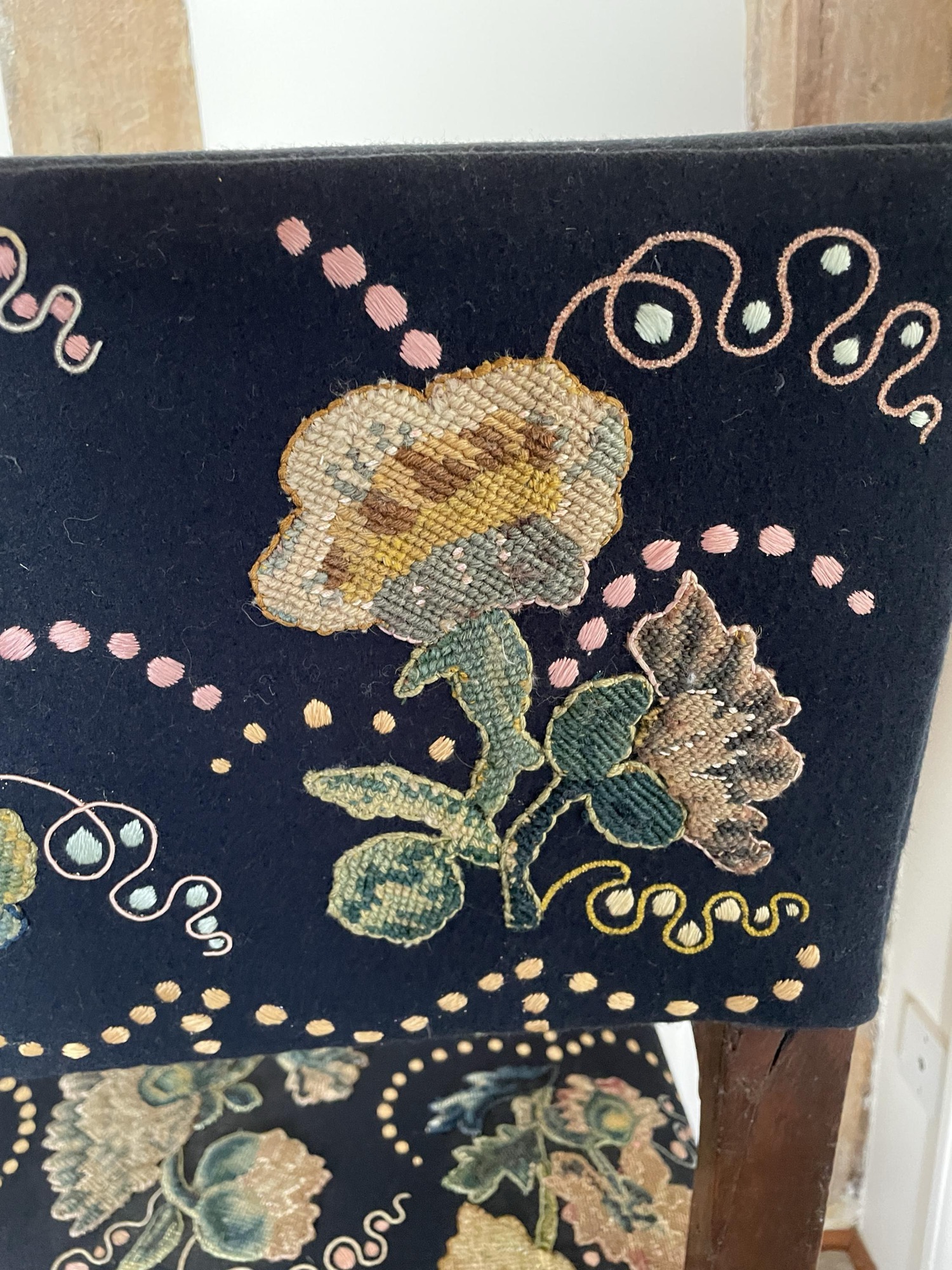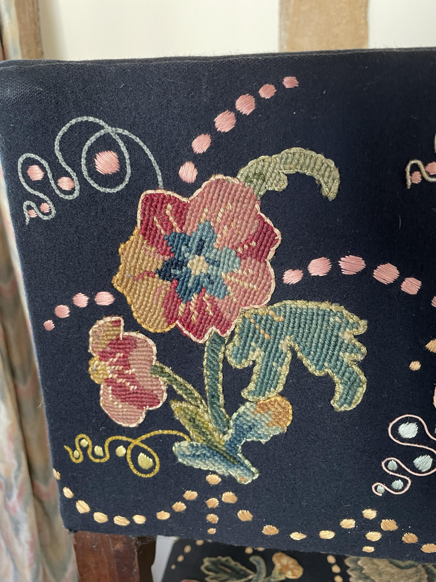 The form of these chairs is characteristic of a stereotypical Renaissance model. The upholstered section of the backs are upholstered in wool with applied 17th century floral needlework faced with gilded studs and supported by square section uprights. The channelled tablet and stylised rosette incised curved arms terminate in acanthus capped carved rams' masks and are supported by column turned uprights headed by an entrelac collar. The ram is a symbol of leadership and authority and it also determination, action, initiative, and Aries, the first sign of the Zodiac. The seats are upholstered in wool with applied 17th century needlework faced with gilded studs and supported by tapering column/ring turned front legs and square section back legs. Some of the stretchers with moulded detailing. Standing on front ball feet. Exceptional original colour and patina. Henri II 1550-60.