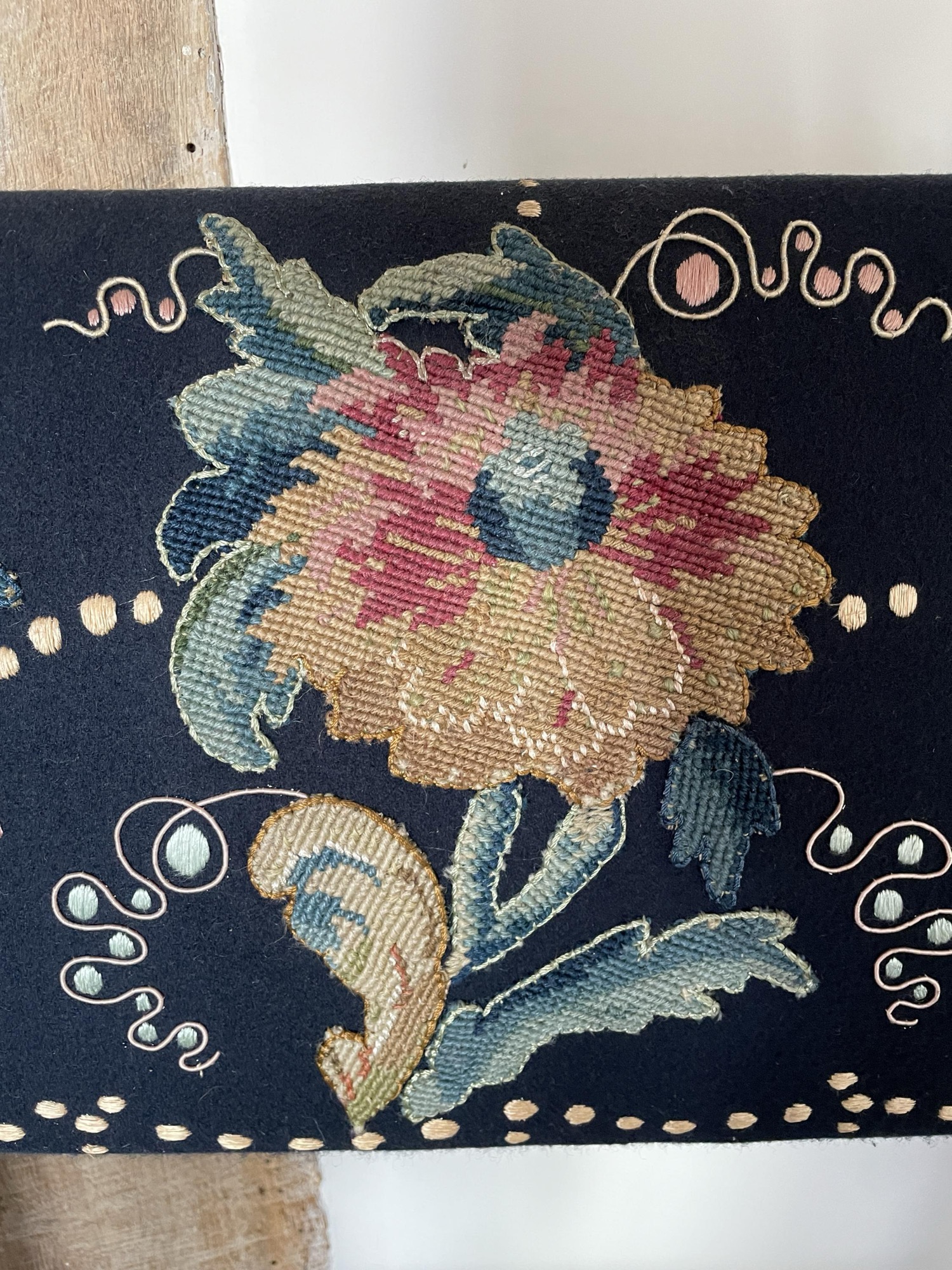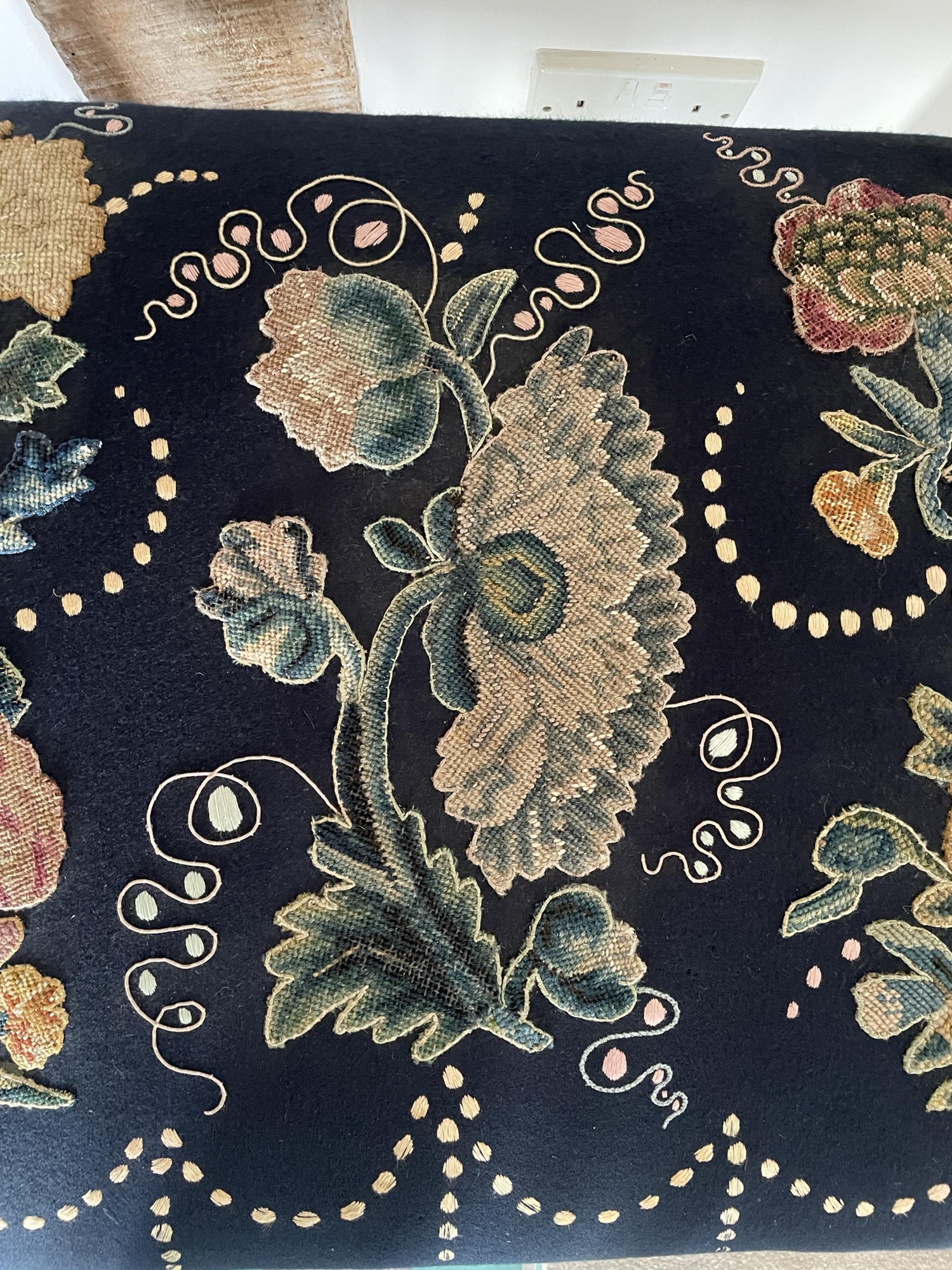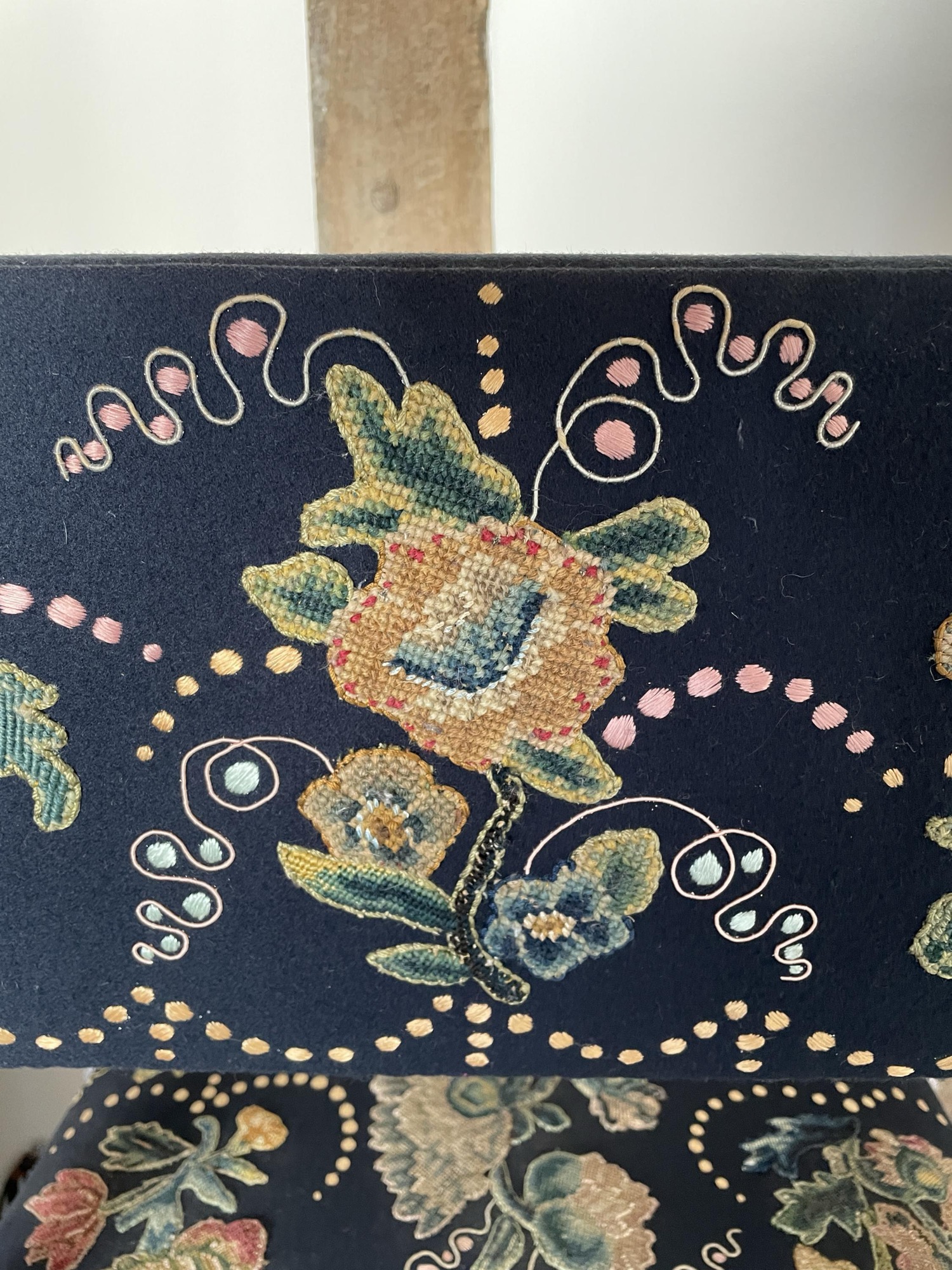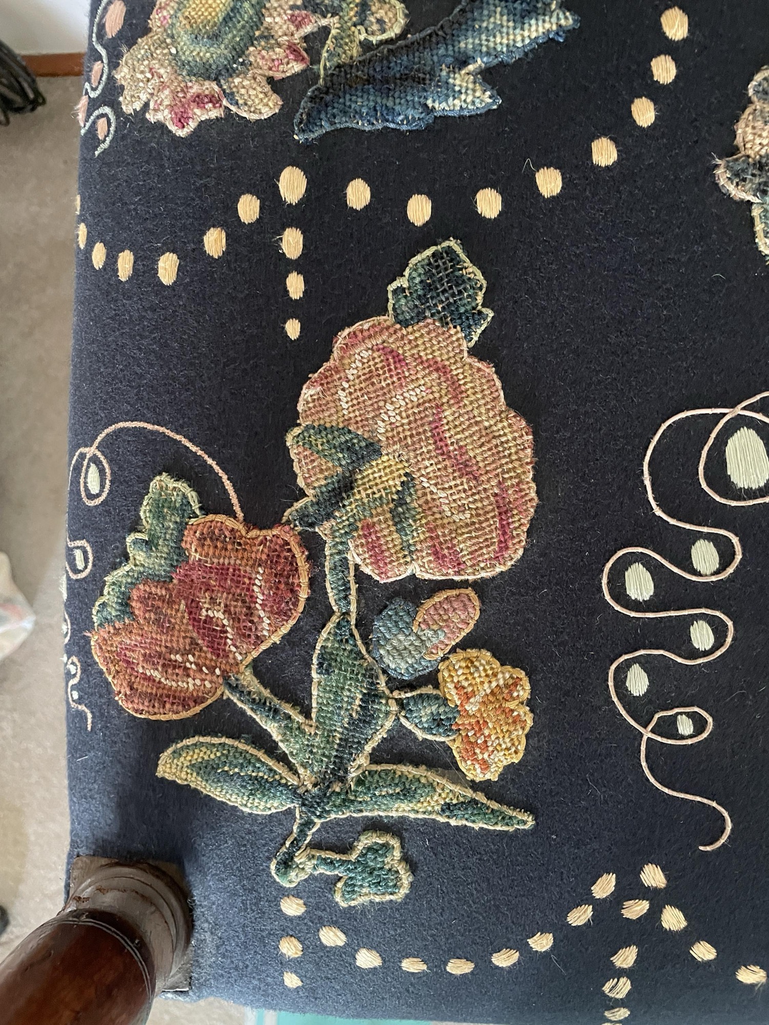 The form of these chairs is characteristic of a stereotypical Renaissance model. The upholstered section of the backs are upholstered in wool with applied 17th century floral needlework faced with gilded studs and supported by square section uprights. The channelled tablet and stylised rosette incised curved arms terminate in acanthus capped carved rams' masks and are supported by column turned uprights headed by an entrelac collar. The ram is a symbol of leadership and authority and it also determination, action, initiative, and Aries, the first sign of the Zodiac. The seats are upholstered in wool with applied 17th century needlework faced with gilded studs and supported by tapering column/ring turned front legs and square section back legs. Some of the stretchers with moulded detailing. Standing on front ball feet. Exceptional original colour and patina. Henri II 1550-60.