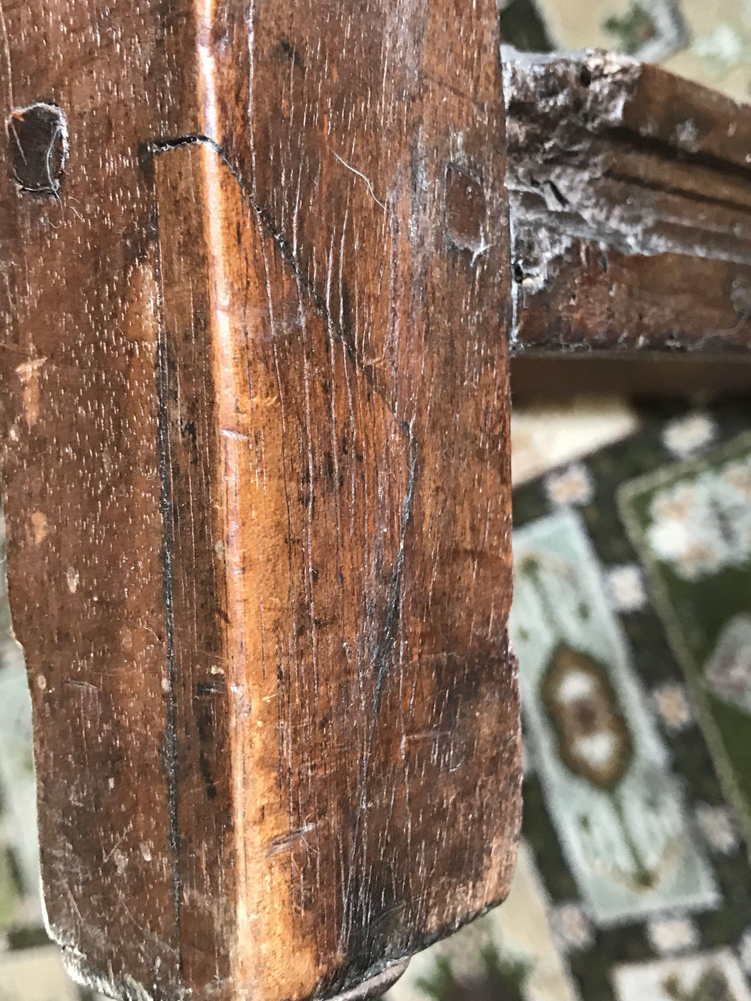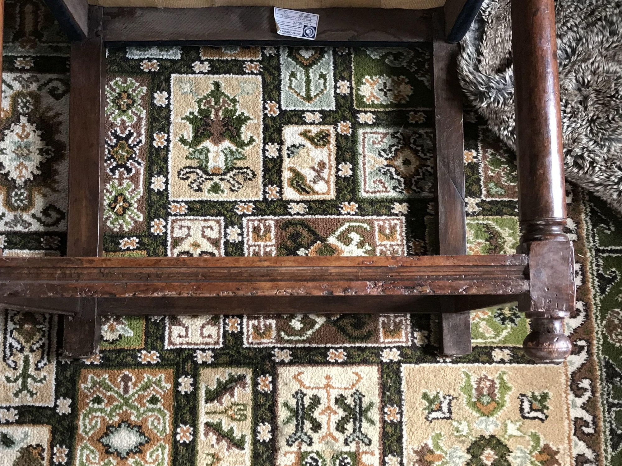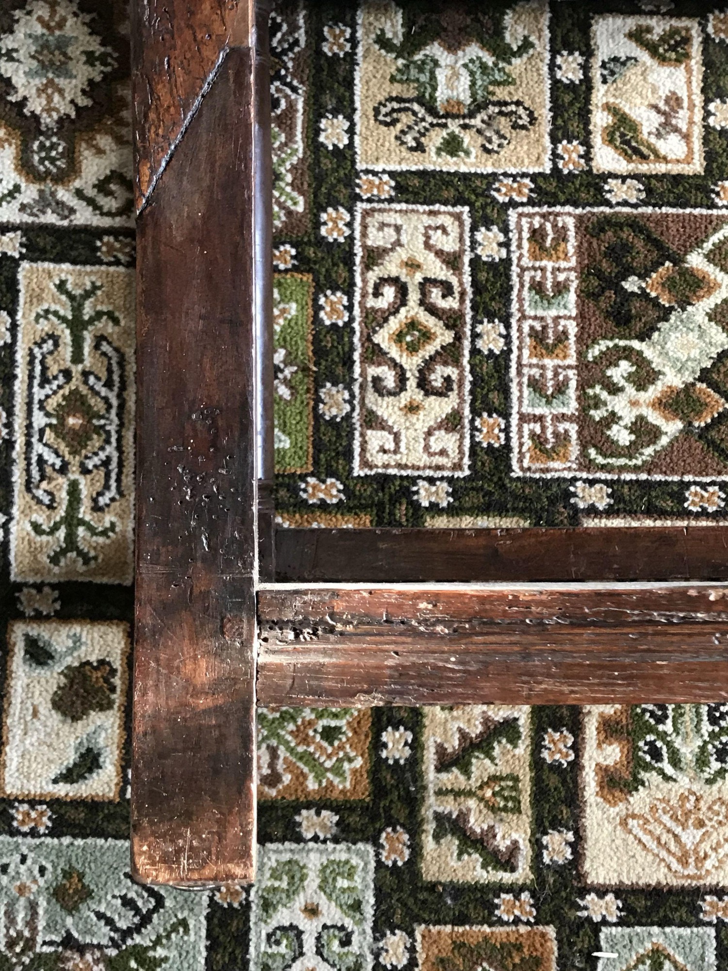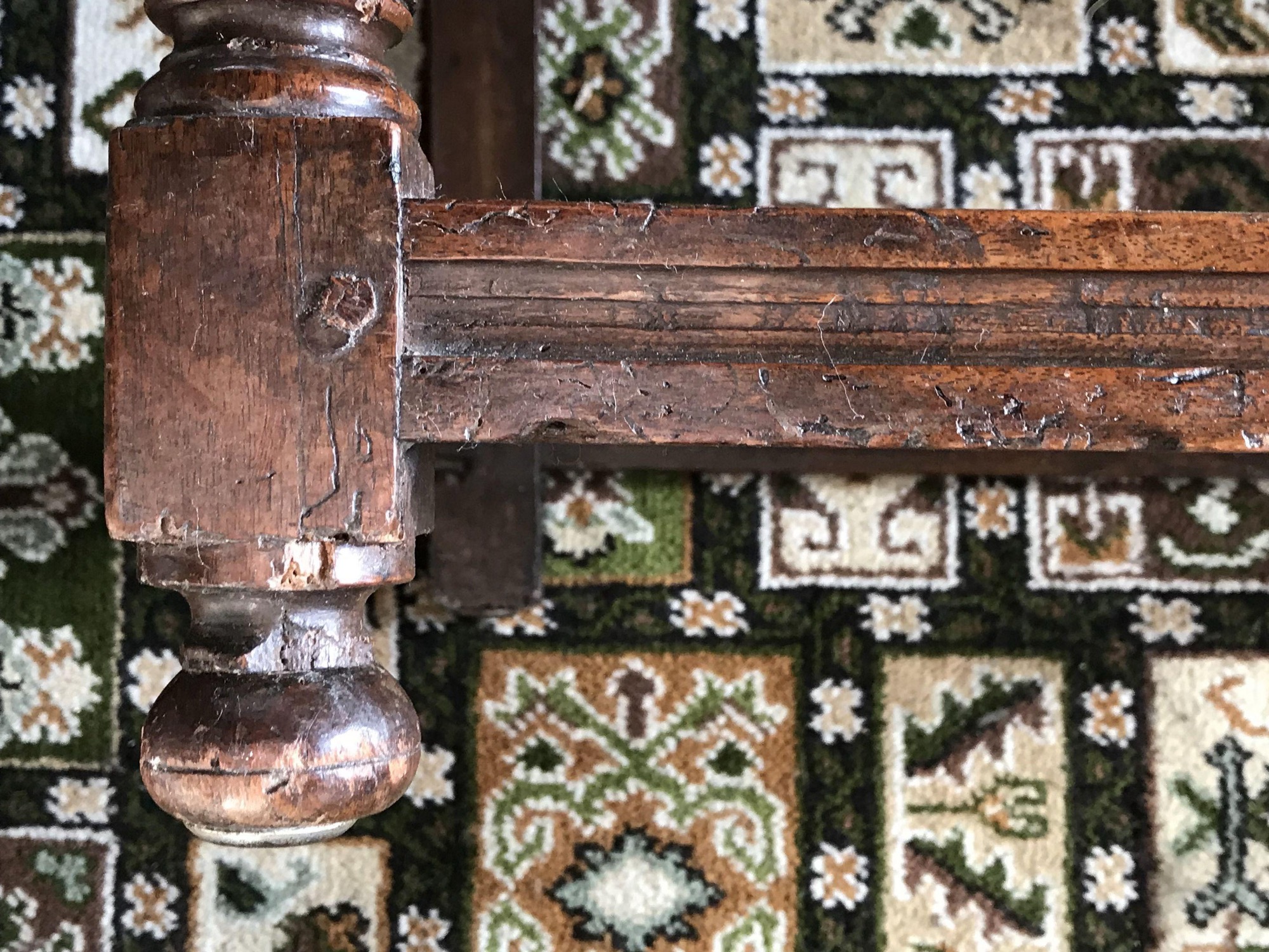 Condition: The chairs are both sturdy with exceptional colour and patina. One armchair with a splice on the rhs back leg and replaced but period front and lhs stretcher both bearing old nail marks, two other replaced stretchers and the back uprights bearing old nail marks indicating that they were upholstered at some point. The other armchair with an old repair to a break in the right back leg and an old patch near the end of the leg, replaced but period back and lhs stretcher, small patch to bottom of lhs arm where it meets the support. Old worm marks and some losses. Considering the age of the armchairs, these repairs and replacements are not unusual and consistent with the repairs on the related armchairs in museum collections. They suggest that the chairs either fell backwards at some point or someone leant back while sitting in them.