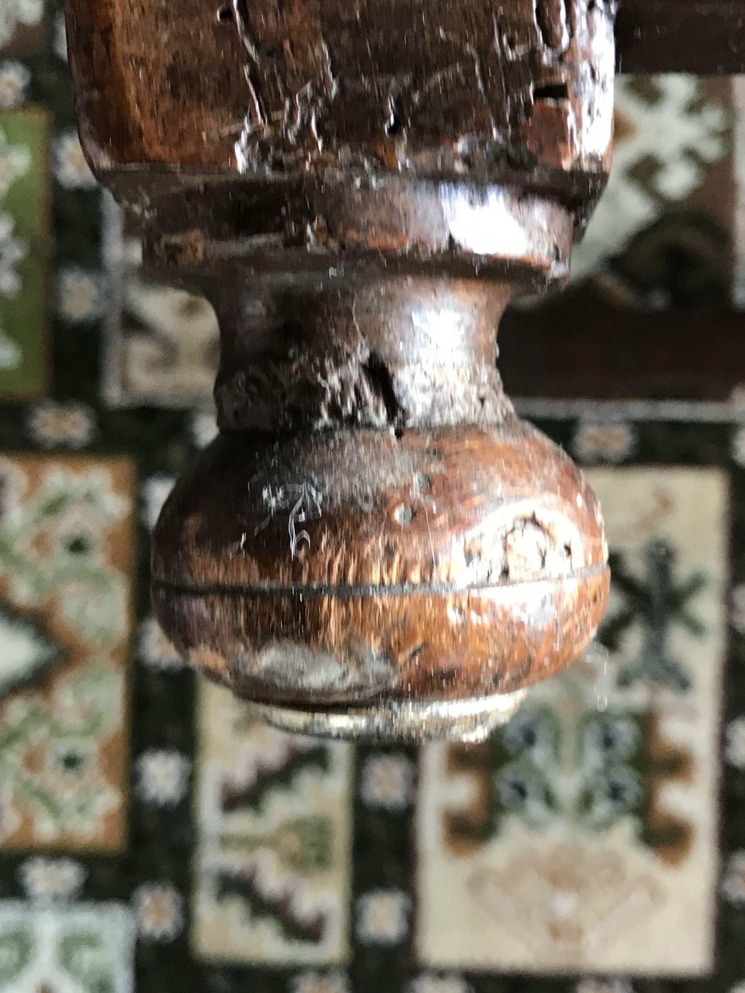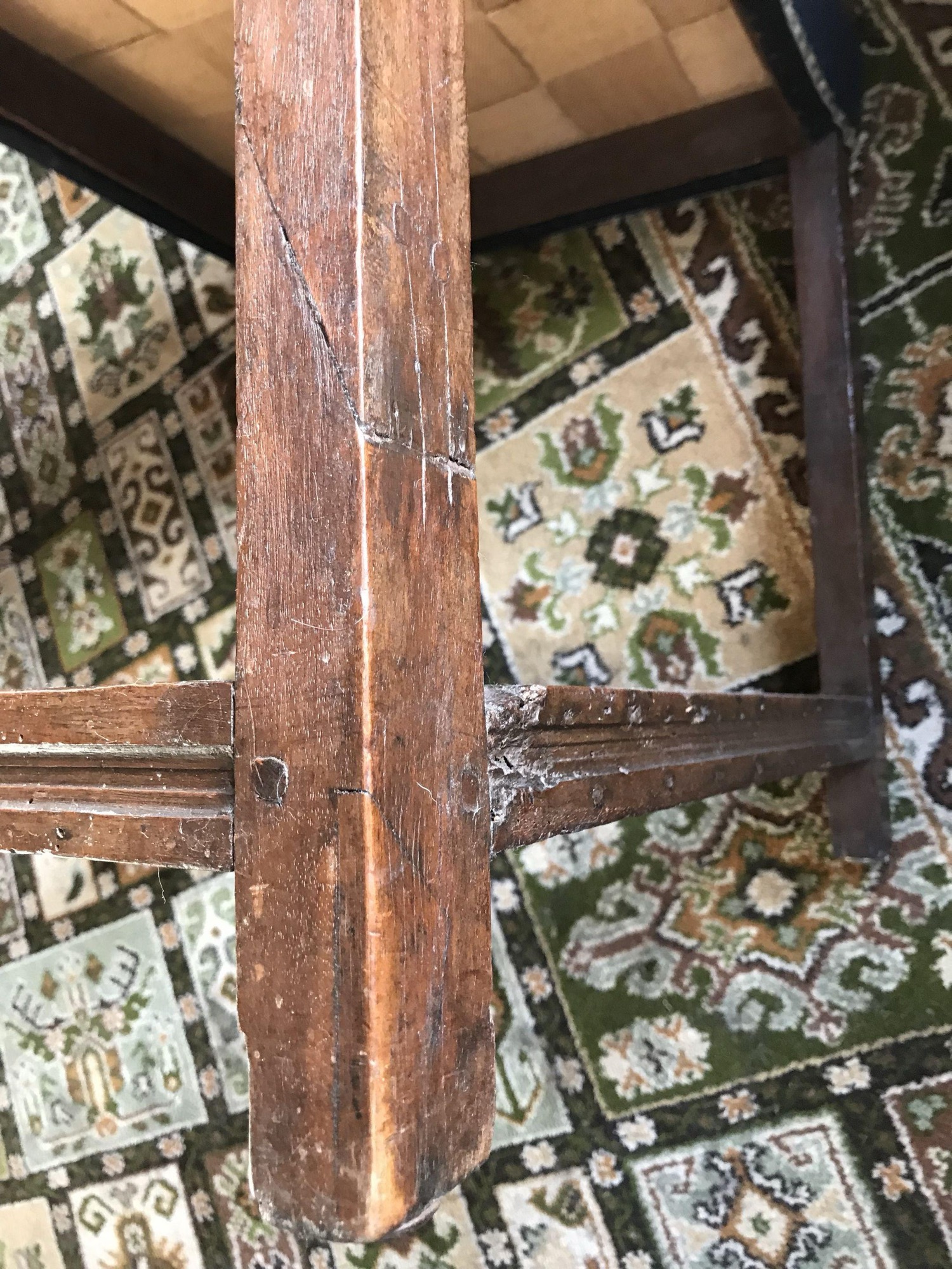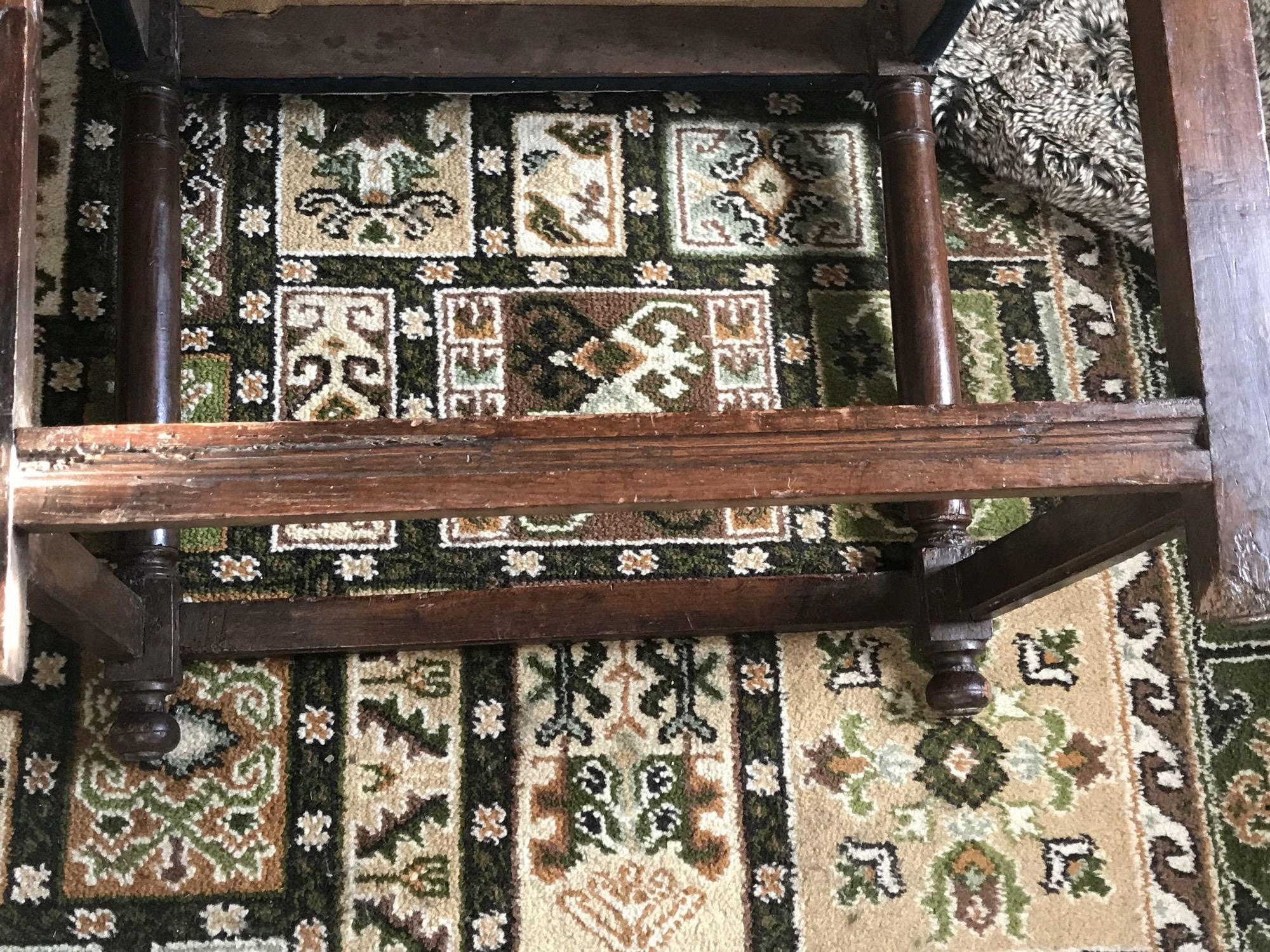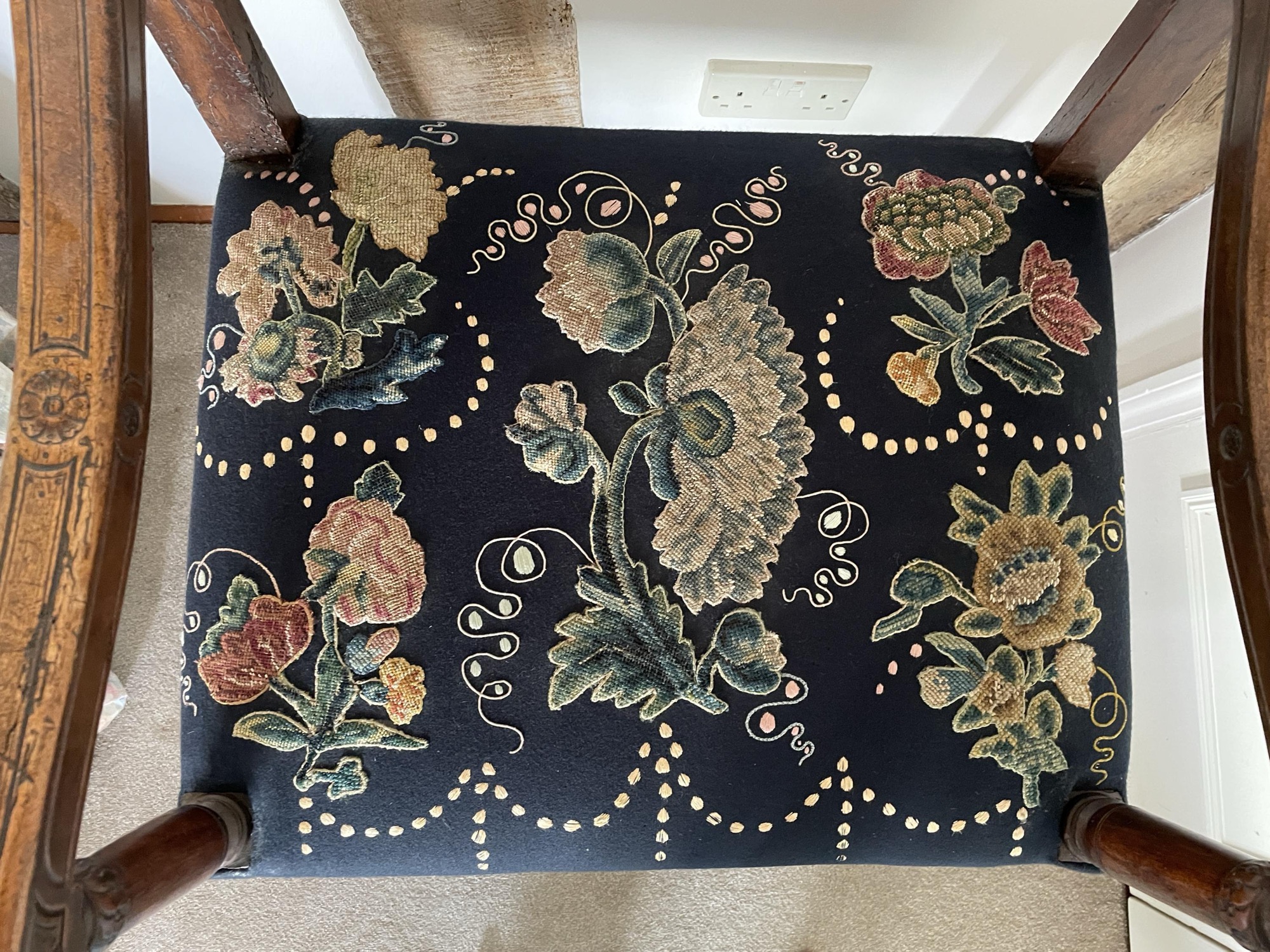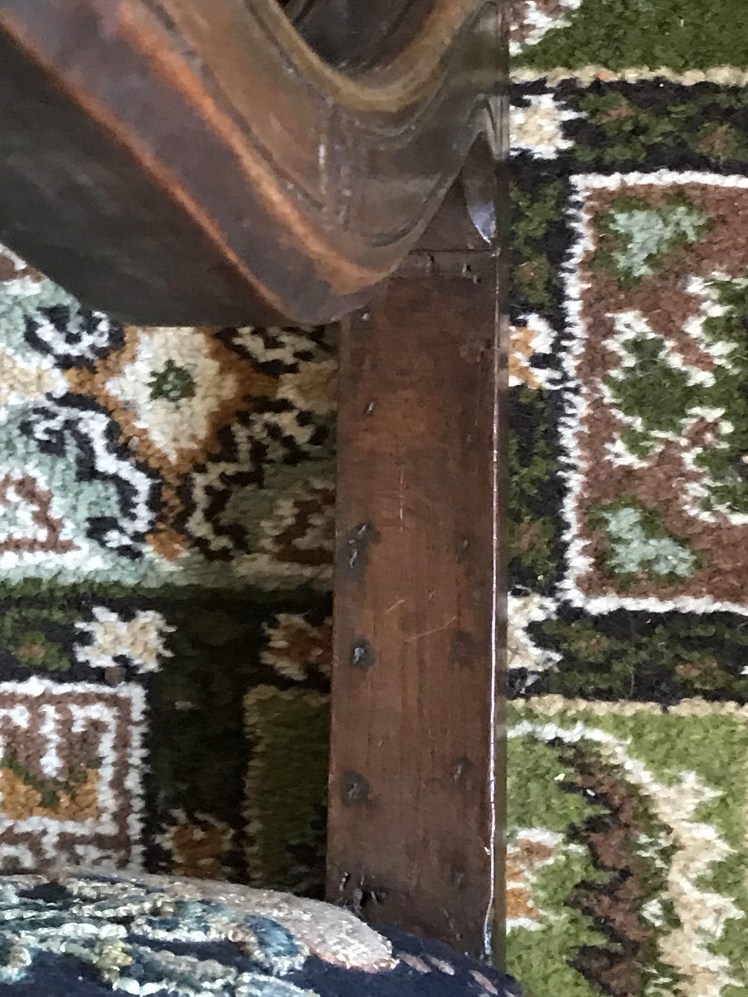 Condition: The chairs are both sturdy with exceptional colour and patina. One armchair with a splice on the rhs back leg and replaced but period front and lhs stretcher both bearing old nail marks, two other replaced stretchers and the back uprights bearing old nail marks indicating that they were upholstered at some point. The other armchair with an old repair to a break in the right back leg and an old patch near the end of the leg, replaced but period back and lhs stretcher, small patch to bottom of lhs arm where it meets the support. Old worm marks and some losses. Considering the age of the armchairs, these repairs and replacements are not unusual and consistent with the repairs on the related armchairs in museum collections. They suggest that the chairs either fell backwards at some point or someone leant back while sitting in them.